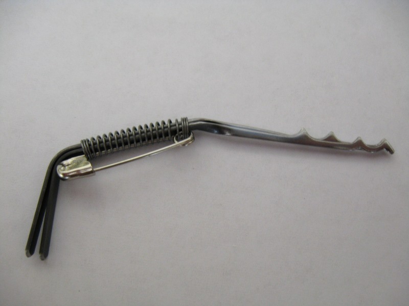 Thought was also given to ergonomics and usability. The first thing that a user may notice about these picks is the unusual shape of the handle. It is bent twice and approximates the shape of a pistol grip. This shape lends itself well to the scrubbing/jiggling motion for which the tools are designed. It also allows the handle of the pick to be used as a tension wrench. This dual-use is central to the design of the Bogotas; they are made in pairs and are meant to be used as such. These pairs are kept together by a clever combination of a spring and safety pin. Not only does this keep the two picks of the Bogota pair together, it also allows them to be pinned up in the user's clothing.
