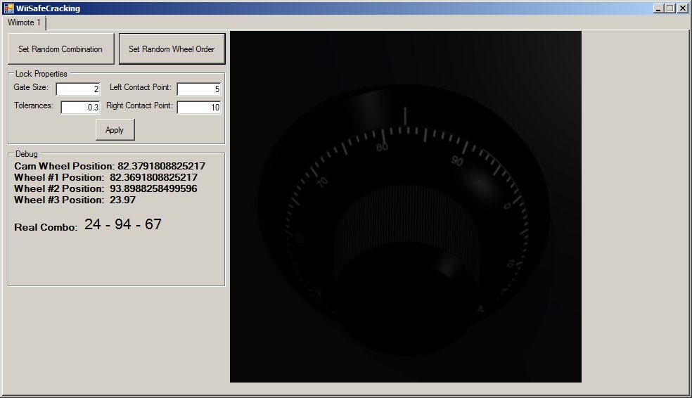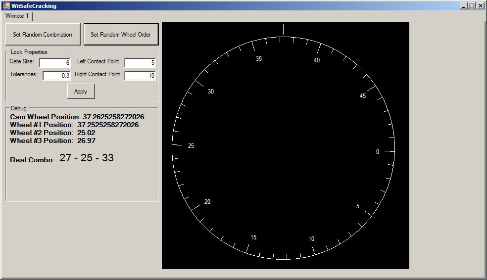 Update #2: I have zipped the app (including the safe dial images) and, with the help of What, uploaded it here. For now, this is only the executable for Windows (tested on Vista so far); I'll toss the source code up soon. In order to run this thing: Unzip the files into any old random folder and run the exe. Prior to that, you must make you wiimote link up with the PC by way of Bluetooth adapter. It must be recognized as a "Human Interface Device" by Windows. I went out and picked up a cheapie USB Bluetooth adapter and everything worked out fine. To get it recognized, I have to double-click the Bluetooth icon in the taskbar and then "Add a Device" while holding down the bottom two buttons on the remote (the lights on it will flash blue). Once the device is registered, it should notify you that it has been recognized as an "HID device". From here, just run the executable, point the wiimote at a sensor bar and give it a turn :-) Building a little safe dial mockup makes this much better; trying to spin the remote like a dial freehand is an exercise in futility. Here is the download link to WiiSafeCracking.