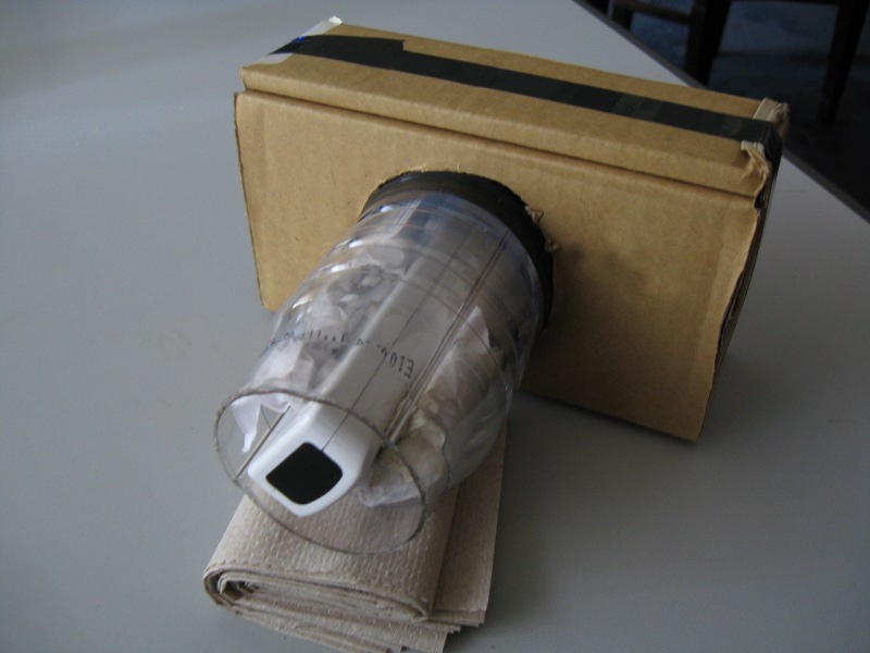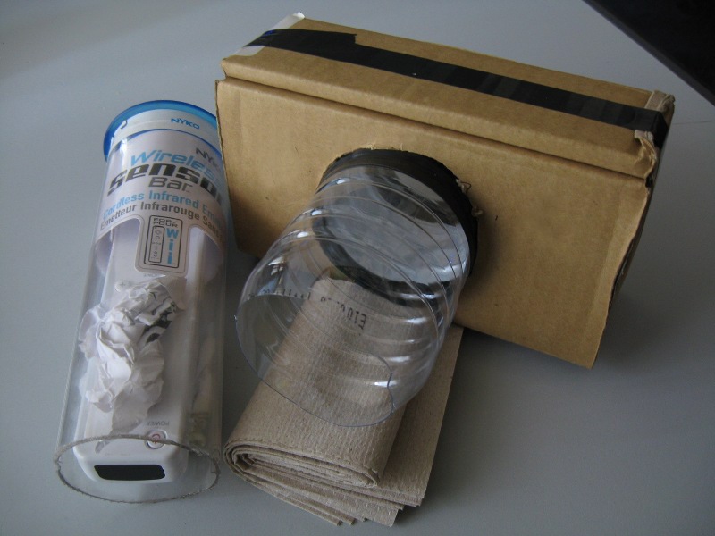 During an off-day; I wrote a safecracking game that uses the Wiimote for input. By combining a cardboard box, plastic tube, water bottle and Wiimote; I built a dial control. It tracks the IR LEDs in the sensor bar (positioned about 4 feet away). The remote sends these coordinates to the PC by way of Bluetooth. My app then does some fancy trig math to figure out what angle the Wiimote is rotated and what dial graduation it is on. It then uses this in a simple simulation of a safe combination lock. The user can manipulate it using conventional methods (for an S&G 6730) to discover the combo and open it (indicated by a little message box for now). The contact points can be sensed through the fingers because the app tells the Wiimote to vibrate for a few milliseconds when passing over them. The next step is to find a real safe dial and attach it to the current dial. This would allow the player to crack the safe without even looking at the monitor (just you and the lock).