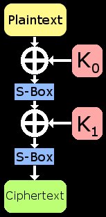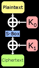 Immediately, I'll describe a toy cipher that will be broken using this technique. It is a small and simple 2-round SPN that uses only substitution boxes and XOR key-mixing. The algorithm accepts a 4-bit block as input along with an 8-bit key; it outputs a 4-bit block. First the plaintext is XOR'd with the first 4 bits of the key (called subkey 0 or K0). Next this is fed into a 4-bit S-Box that provides the cipher's non-linearity. The output of the S-Box is then mixed via XOR with the second 4 bits of the key (subkey 1 or K1) and run though the S-Box again. The block size is small to facilitate learning and this keeps the S-Box size small as well. The parameters of this toy cipher are such that the reader could work through the process "by hand" on paper if desired.