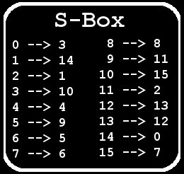 We'll define the actual values in the S-Box later. For now, it is sufficient to say that the mapping is bijective. This means that for every input there is a unique output and every output also uniquely cooresponds to an input. In other words, if one knows the output of the S-Box, they can easily recover the cooresponding input to it. If this cipher only used S-Boxes, anyone could easily take advantage of this and run a ciphertext backward through the boxes to recover the plaintext. If the cipher used only XOR key-mixing, an attacker could use the properties of XOR and a single known plaintext/ciphertext pair to recover the key. By combining these functions, the security of this cipher is improved dramatically.