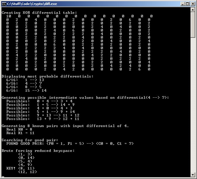 Source Code - This program, written in C, implements the simplified version of the toy cipher. It then calculates the most probable differential characteristics, displays all possible inputs/outputs for one selected characteristic (4 -> 7), and recovers the key in less time than brute force. I recommend following the code while reading this page; starting from main() and checking out the functions as this tutorial proceeds may speed you toward the "Eureka!" moment.
