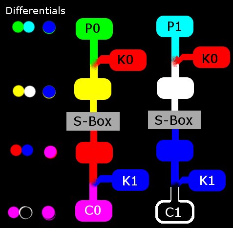 In an effort to help the reader further understand how this works, I made the diagram below. It shows a good pair running through the cipher and the associated differentials along the way. The operation in GIMP/Photoshop that was used to "XOR" the colors was "Difference" because it has the same properties. The good differential characteristic used here is "Blue --> Purple". Some folks get along better with visuals than numbers and if you study this along with the code and the rest of this tutorial, it may help.